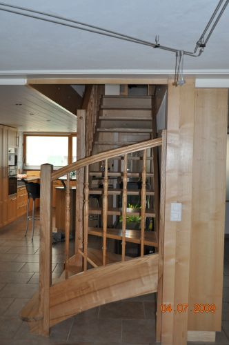 Compétences du charpentier qui concrétise une forme dans l'espace, habileté du menuisier à choisir et façonner la matière, et sens du détail de l'ébéniste qui privilégie esthétisme et finition: la fabrication d'un escalier fait appel à tous les savoir-faire de l'entreprise.